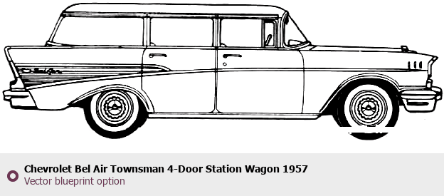 Raster blueprint of the 1957 Chevrolet Bel Air Townsman 4-Door Station Wagon Wagon. This free downloadable image can be used for graphic projects, digital design, and 3D modeling. The file provides accurate exterior proportions of the vehicle. Model year: 1957. Body type: Wagon.