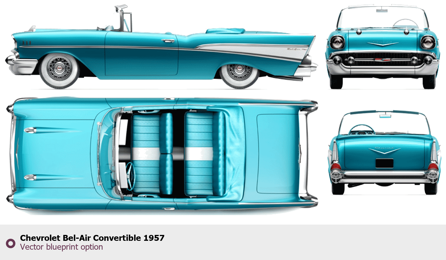 Raster blueprint of the 1957 Chevrolet Bel-Air Convertible Cabriolet. This free downloadable image can be used for graphic projects, digital design, and 3D modeling. The file provides accurate exterior proportions of the vehicle. Model year: 1957. Body type: Cabriolet.