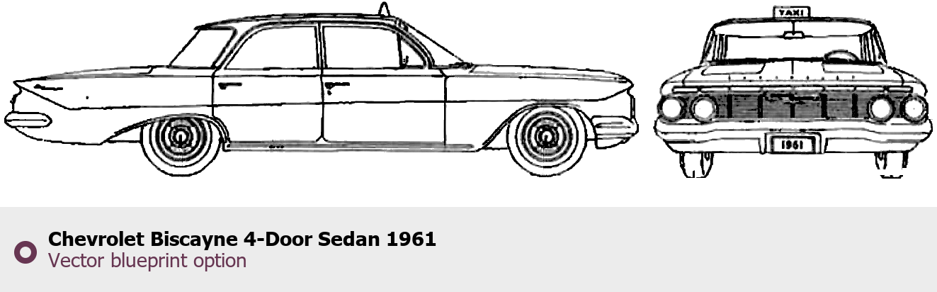 Raster blueprint of the 1961 Chevrolet Biscayne 4-Door Sedan Sedan. This free downloadable image can be used for graphic projects, digital design, and 3D modeling. The file provides accurate exterior proportions of the vehicle. Model year: 1961. Body type: Sedan.