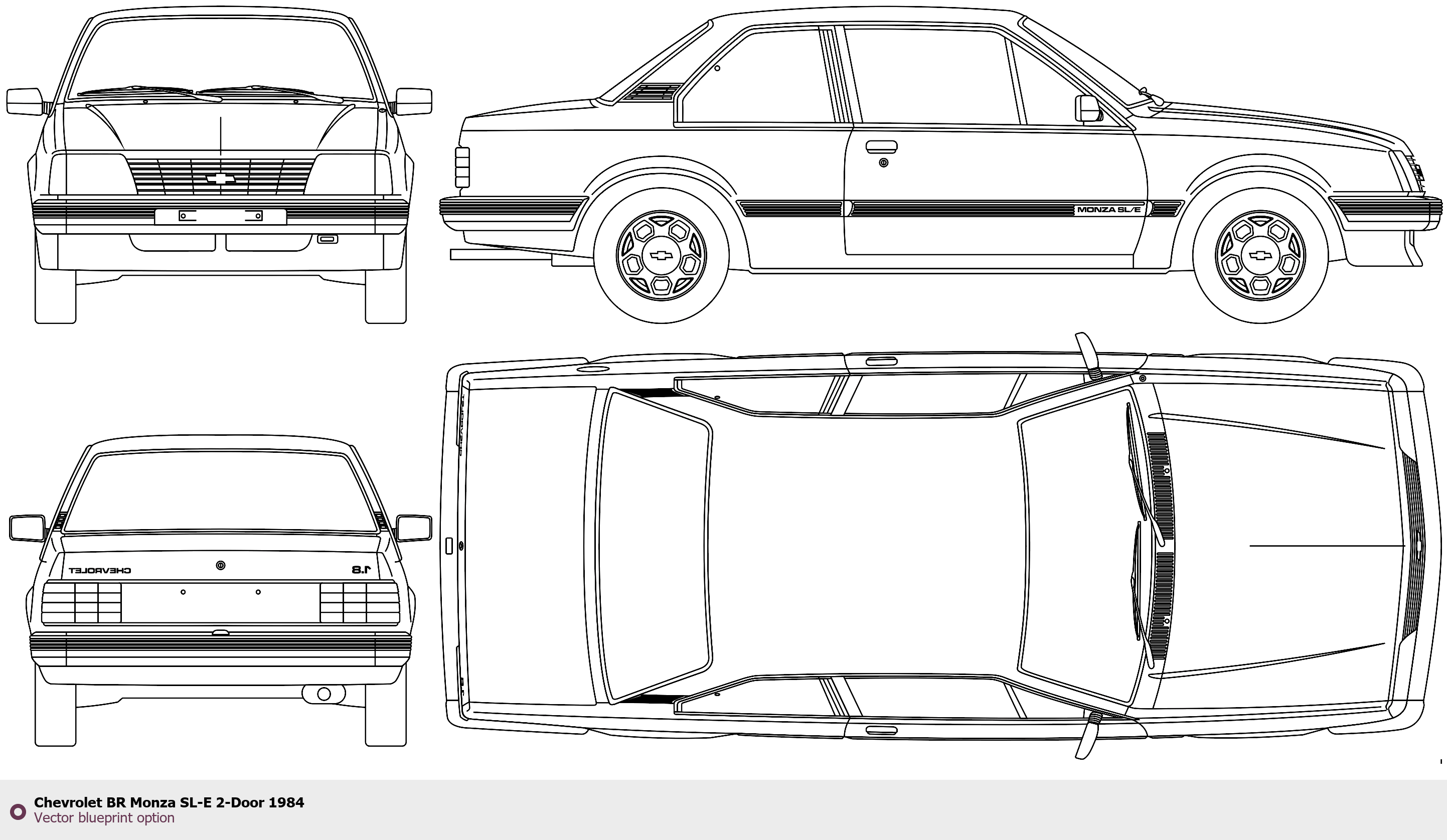 Raster blueprint of the 1984 Chevrolet BR Monza SL-E 2-Door Tag. This free downloadable image can be used for graphic projects, digital design, and 3D modeling. The file provides accurate exterior proportions of the vehicle. Model year: 1984. Body type: Tag.