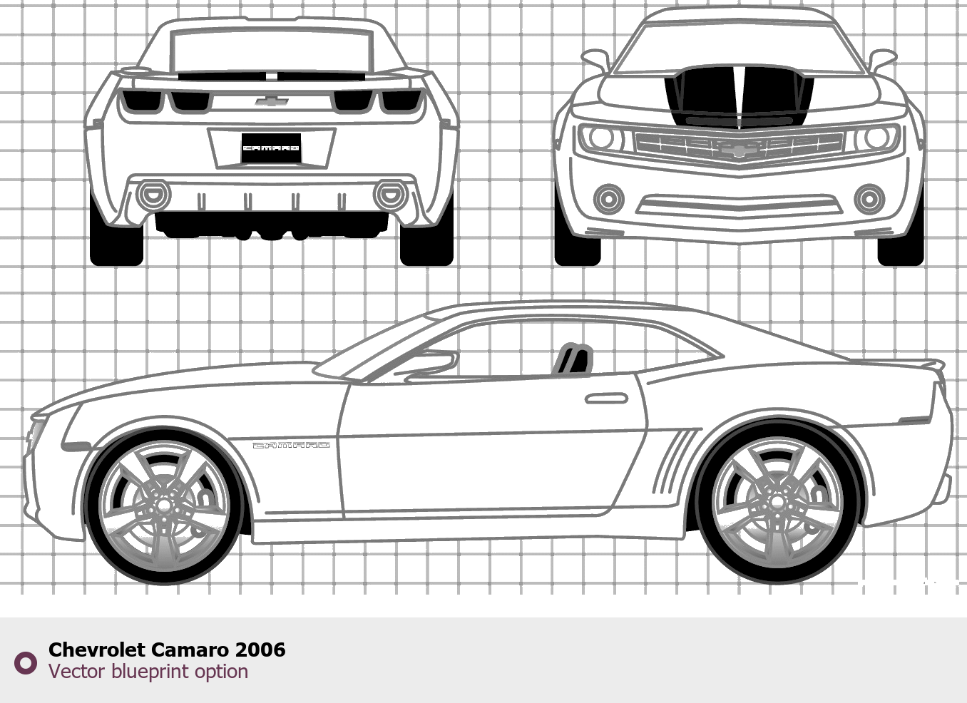Raster blueprint of the 2006 Chevrolet Camaro Tag. This free downloadable image can be used for graphic projects, digital design, and 3D modeling. The file provides accurate exterior proportions of the vehicle. Model year: 2006. Body type: Tag.
