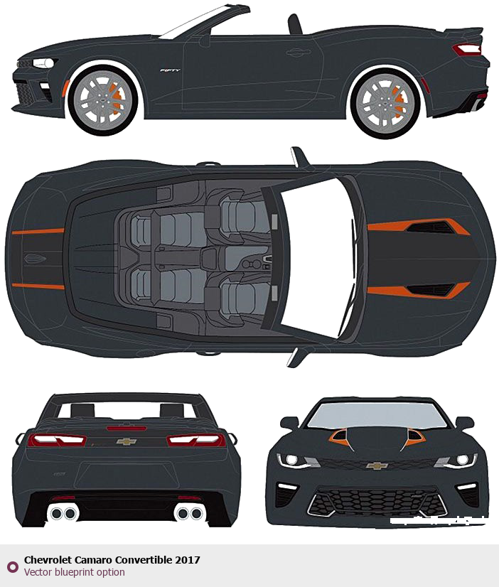 Raster blueprint of the 2017 Chevrolet Camaro Convertible Cabriolet. This free downloadable image can be used for graphic projects, digital design, and 3D modeling. The file provides accurate exterior proportions of the vehicle. Model year: 2017. Body type: Cabriolet.