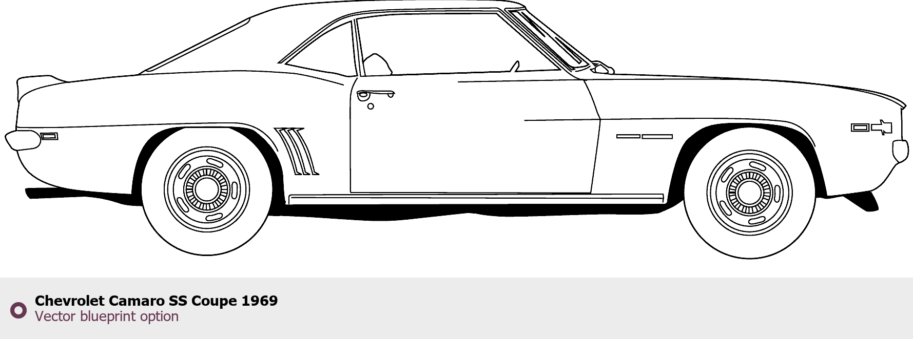 Raster blueprint of the 1969 Chevrolet Camaro SS Coupe Coupe. This free downloadable image can be used for graphic projects, digital design, and 3D modeling. The file provides accurate exterior proportions of the vehicle. Model year: 1969. Body type: Coupe.