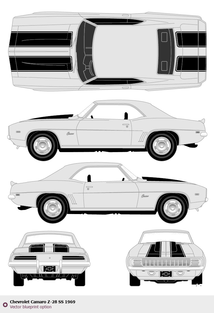 Raster blueprint of the 1969 Chevrolet Camaro Z-28 SS Tag. This free downloadable image can be used for graphic projects, digital design, and 3D modeling. The file provides accurate exterior proportions of the vehicle. Model year: 1969. Body type: Tag.