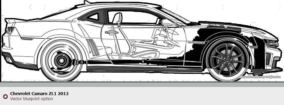 Raster blueprint of the 2012 Chevrolet Camaro ZL1 Tag. This free downloadable image can be used for graphic projects, digital design, and 3D modeling. The file provides accurate exterior proportions of the vehicle. Model year: 2012. Body type: Tag.