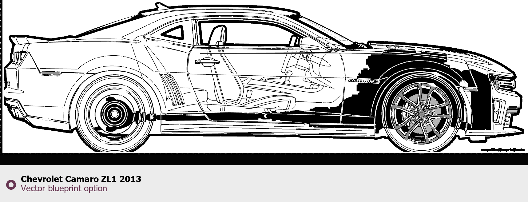 Raster blueprint of the 2013 Chevrolet Camaro ZL1 Tag. This free downloadable image can be used for graphic projects, digital design, and 3D modeling. The file provides accurate exterior proportions of the vehicle. Model year: 2013. Body type: Tag.