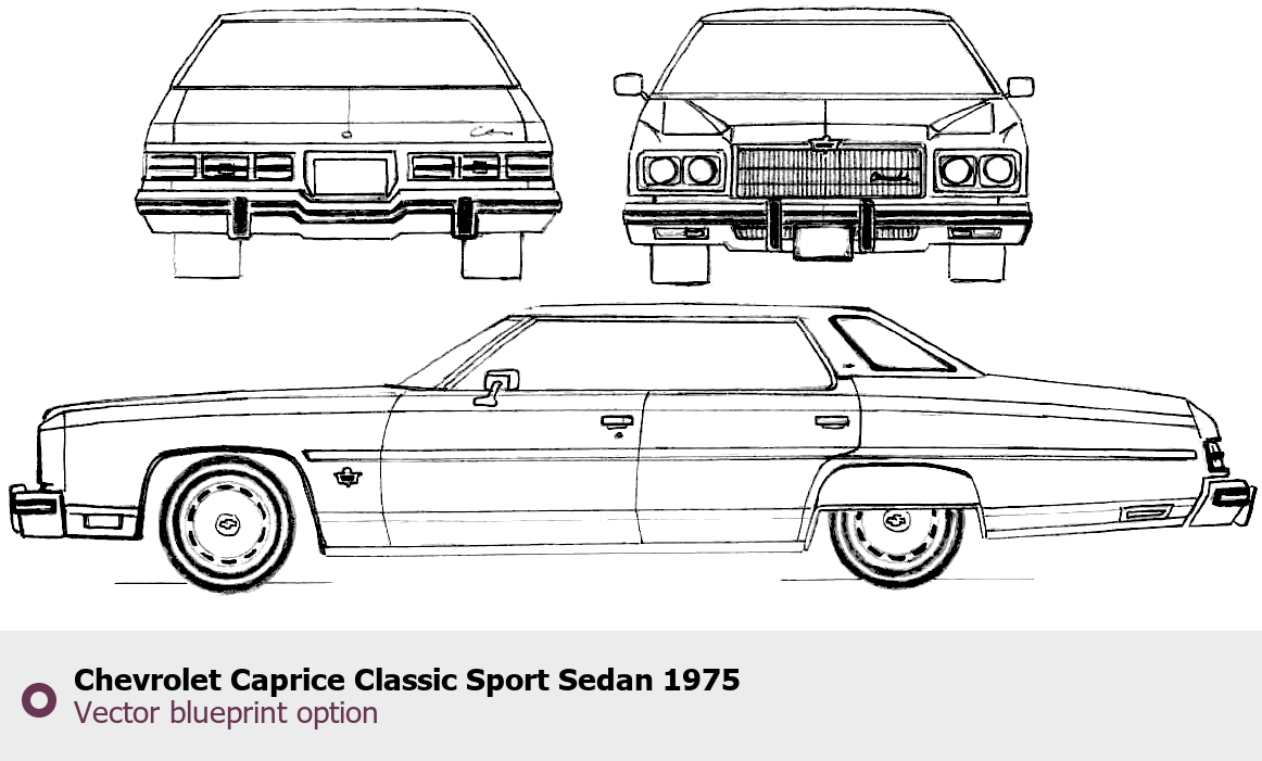 Raster blueprint of the 1975 Chevrolet Caprice Classic Sport Sedan Sedan. This free downloadable image can be used for graphic projects, digital design, and 3D modeling. The file provides accurate exterior proportions of the vehicle. Model year: 1975. Body type: Sedan.