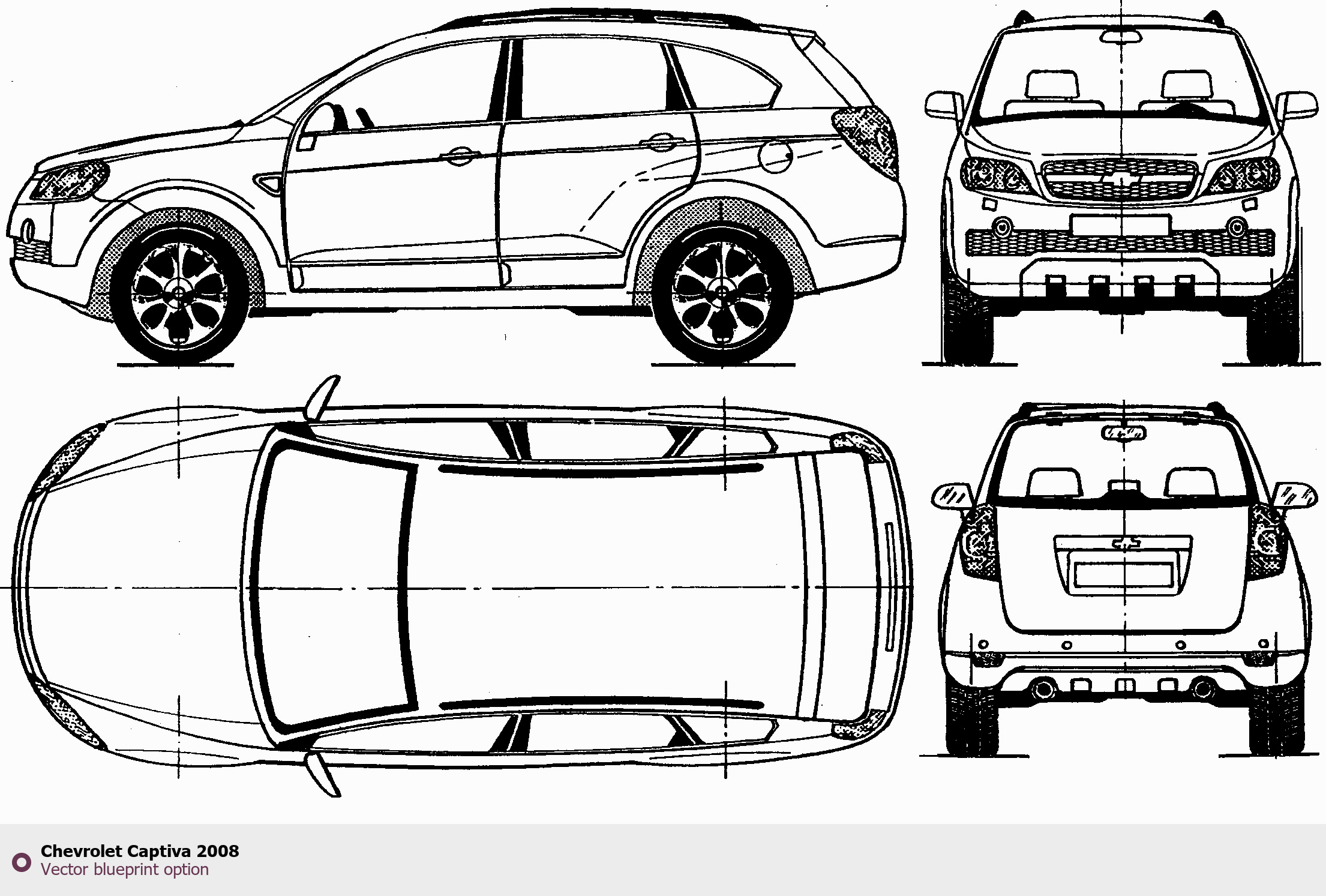 Raster blueprint of the 2008 Chevrolet Captiva SUV. This free downloadable image can be used for graphic projects, digital design, and 3D modeling. The file provides accurate exterior proportions of the vehicle. Model year: 2008. Body type: SUV.