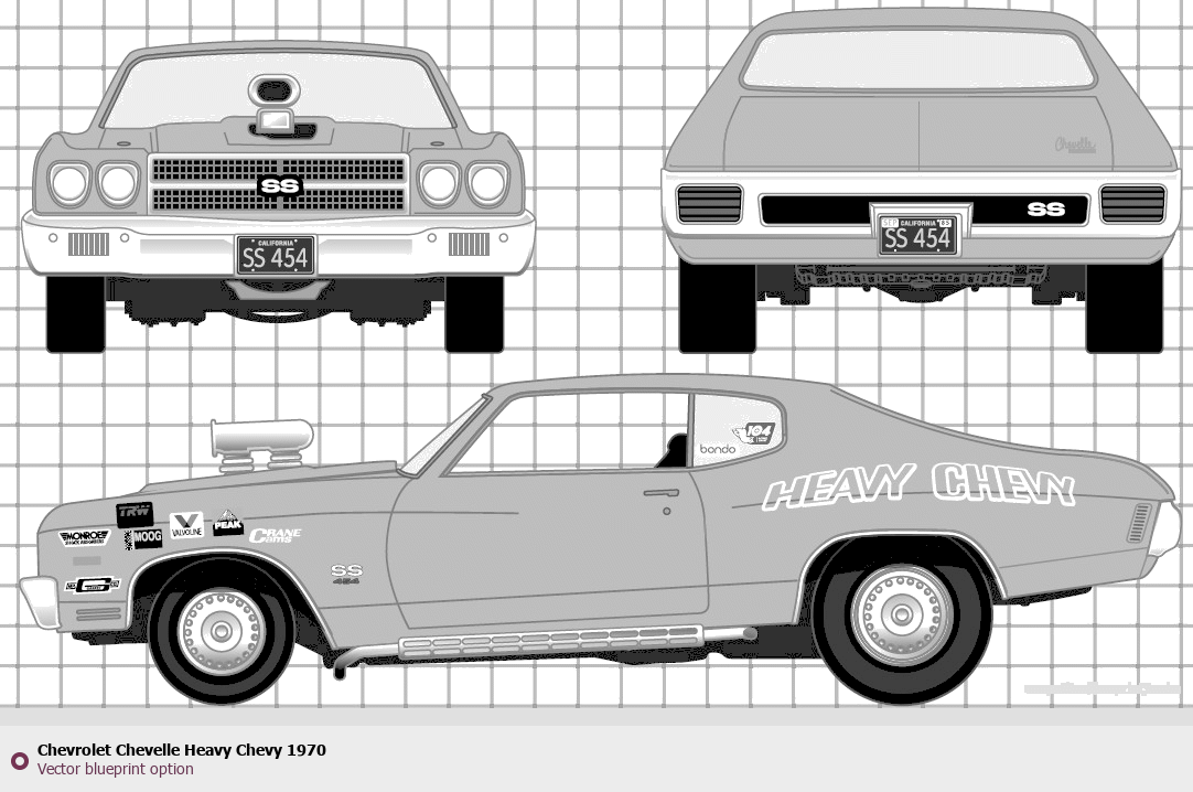 Raster blueprint of the 1970 Chevrolet Chevelle Heavy Chevy Tag. This free downloadable image can be used for graphic projects, digital design, and 3D modeling. The file provides accurate exterior proportions of the vehicle. Model year: 1970. Body type: Tag.