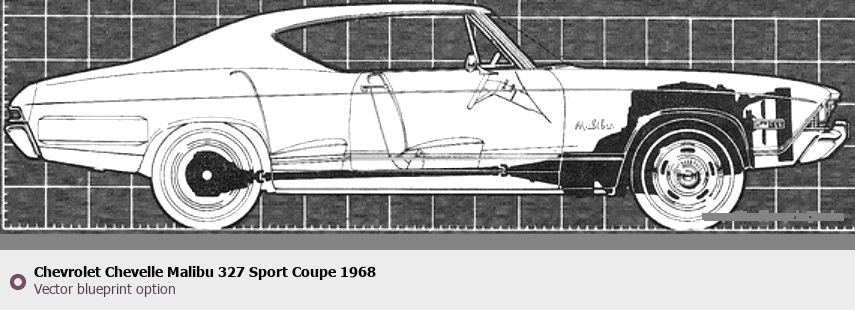 Raster blueprint of the 1968 Chevrolet Chevelle Malibu 327 Sport Coupe Coupe. This free downloadable image can be used for graphic projects, digital design, and 3D modeling. The file provides accurate exterior proportions of the vehicle. Model year: 1968. Body type: Coupe.
