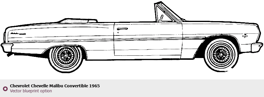 Raster blueprint of the 1965 Chevrolet Chevelle Malibu Convertible Cabriolet. This free downloadable image can be used for graphic projects, digital design, and 3D modeling. The file provides accurate exterior proportions of the vehicle. Model year: 1965. Body type: Cabriolet.