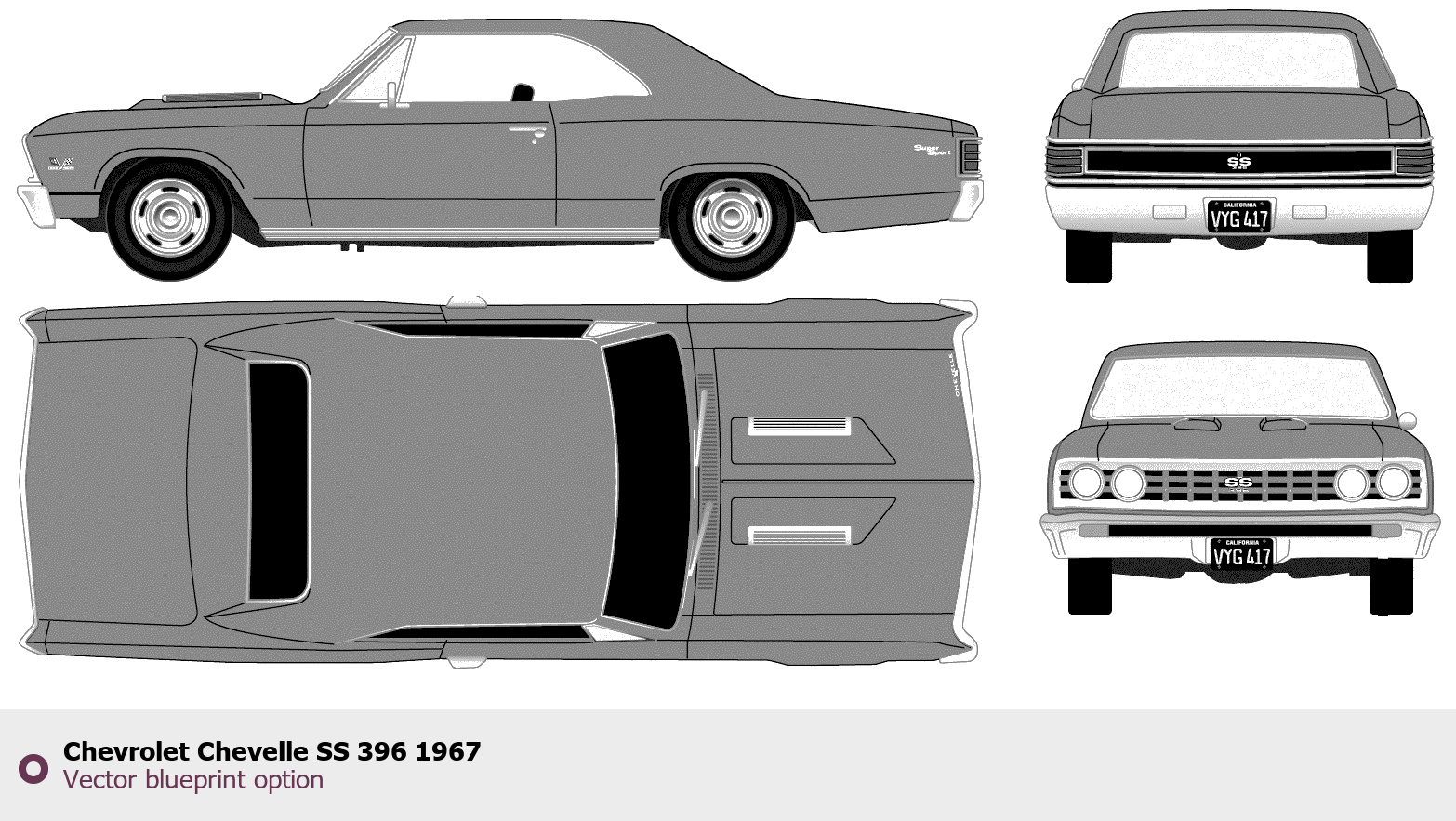 Raster blueprint of the 1967 Chevrolet Chevelle SS 396 Tag. This free downloadable image can be used for graphic projects, digital design, and 3D modeling. The file provides accurate exterior proportions of the vehicle. Model year: 1967. Body type: Tag.