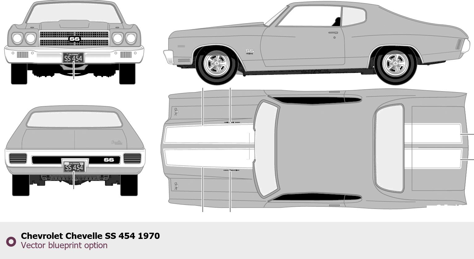 Raster blueprint of the 1970 Chevrolet Chevelle SS 454 Tag. This free downloadable image can be used for graphic projects, digital design, and 3D modeling. The file provides accurate exterior proportions of the vehicle. Model year: 1970. Body type: Tag.