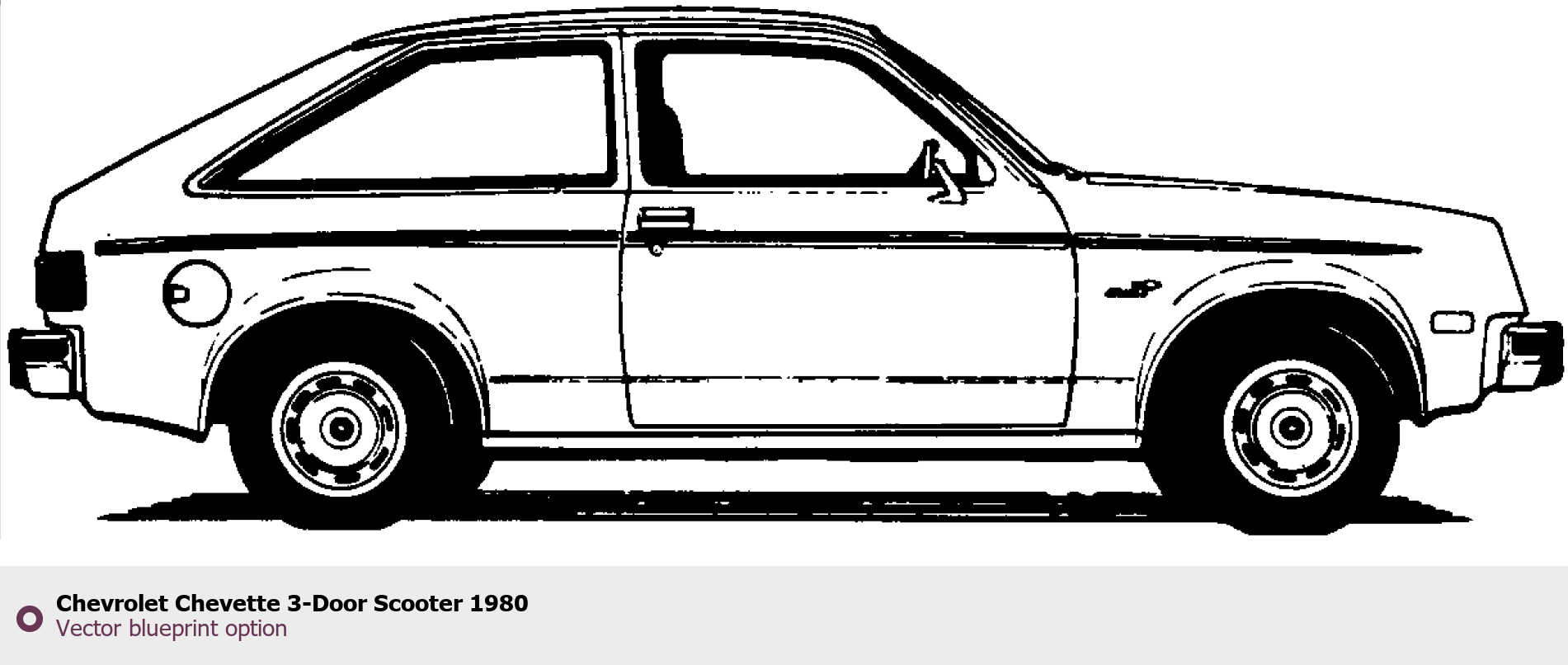 Raster blueprint of the 1980 Chevrolet Chevette 3-Door Scooter Tag. This free downloadable image can be used for graphic projects, digital design, and 3D modeling. The file provides accurate exterior proportions of the vehicle. Model year: 1980. Body type: Tag.