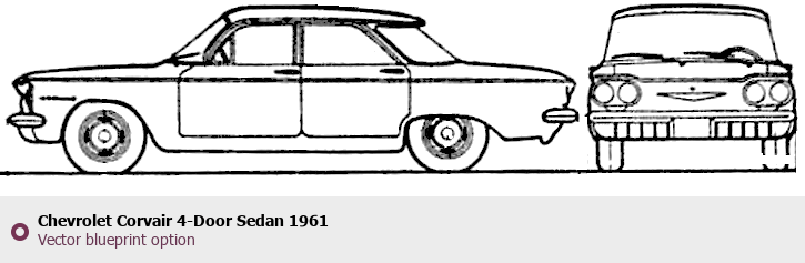 Raster blueprint of the 1961 Chevrolet Corvair 4-Door Sedan Sedan. This free downloadable image can be used for graphic projects, digital design, and 3D modeling. The file provides accurate exterior proportions of the vehicle. Model year: 1961. Body type: Sedan.