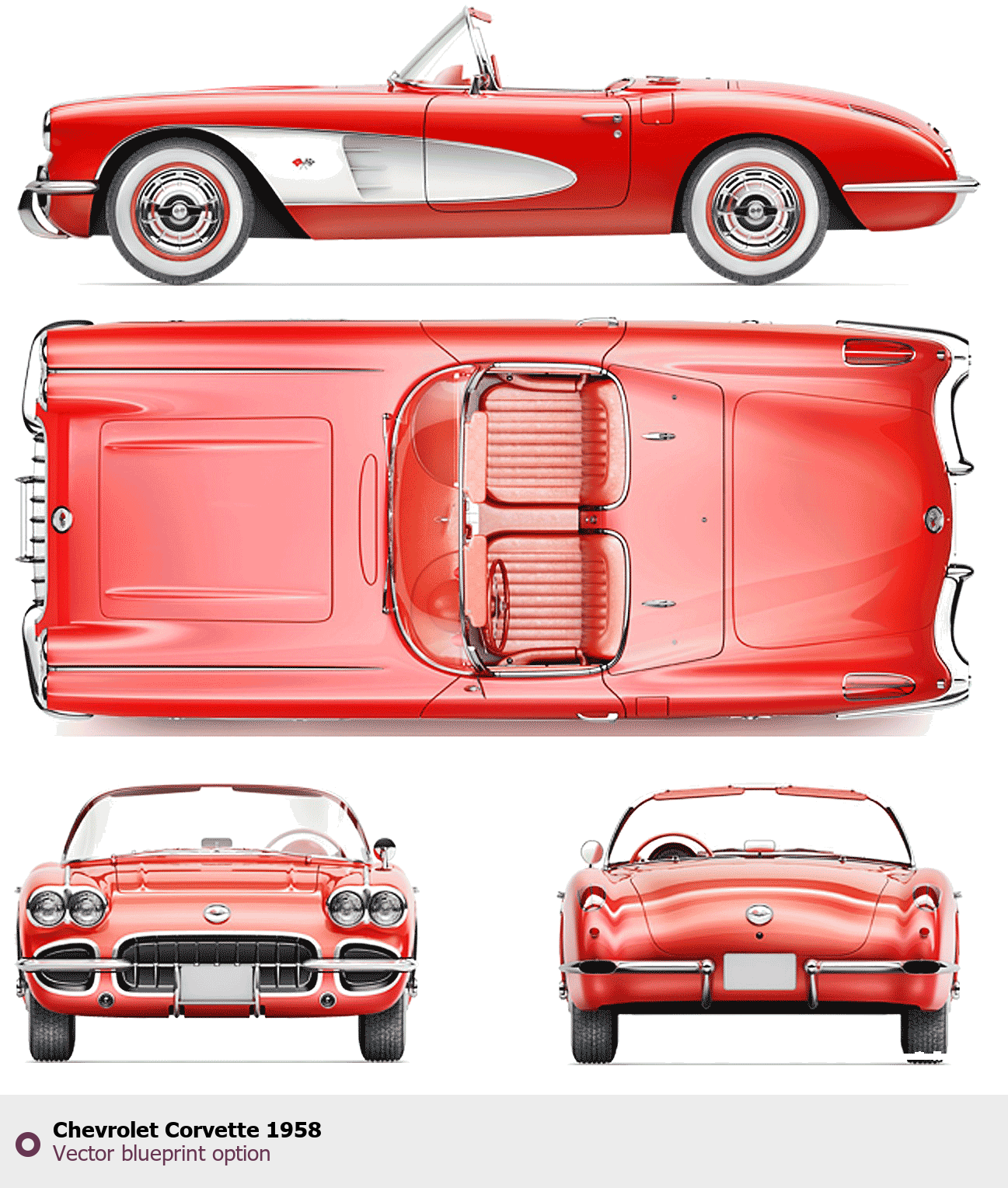 Raster blueprint of the 1958 Chevrolet Corvette Tag. This free downloadable image can be used for graphic projects, digital design, and 3D modeling. The file provides accurate exterior proportions of the vehicle. Model year: 1958. Body type: Tag.