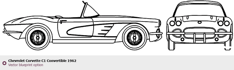 Raster blueprint of the 1962 Chevrolet Corvette C1 Convertible Cabriolet. This free downloadable image can be used for graphic projects, digital design, and 3D modeling. The file provides accurate exterior proportions of the vehicle. Model year: 1962. Body type: Cabriolet.