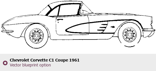 Raster blueprint of the 1961 Chevrolet Corvette C1 Coupe Coupe. This free downloadable image can be used for graphic projects, digital design, and 3D modeling. The file provides accurate exterior proportions of the vehicle. Model year: 1961. Body type: Coupe.