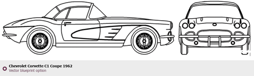 Raster blueprint of the 1962 Chevrolet Corvette C1 Coupe Coupe. This free downloadable image can be used for graphic projects, digital design, and 3D modeling. The file provides accurate exterior proportions of the vehicle. Model year: 1962. Body type: Coupe.