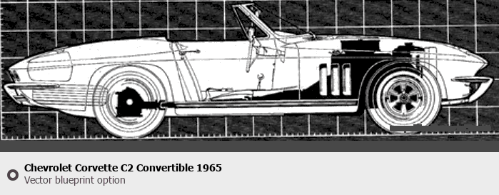 Raster blueprint of the 1965 Chevrolet Corvette C2 Convertible Cabriolet. This free downloadable image can be used for graphic projects, digital design, and 3D modeling. The file provides accurate exterior proportions of the vehicle. Model year: 1965. Body type: Cabriolet.