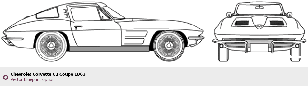 Raster blueprint of the 1963 Chevrolet Corvette C2 Coupe Coupe. This free downloadable image can be used for graphic projects, digital design, and 3D modeling. The file provides accurate exterior proportions of the vehicle. Model year: 1963. Body type: Coupe.