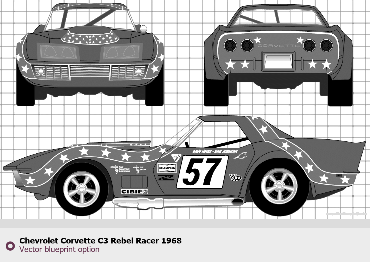 Raster blueprint of the 1968 Chevrolet Corvette C3 Rebel Racer Tag. This free downloadable image can be used for graphic projects, digital design, and 3D modeling. The file provides accurate exterior proportions of the vehicle. Model year: 1968. Body type: Tag.