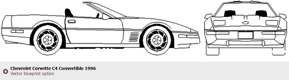 Raster blueprint of the 1996 Chevrolet Corvette C4 Convertible Cabriolet. This free downloadable image can be used for graphic projects, digital design, and 3D modeling. The file provides accurate exterior proportions of the vehicle. Model year: 1996. Body type: Cabriolet.