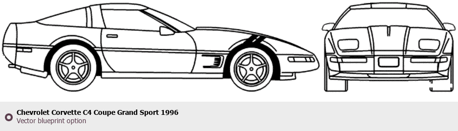 Raster blueprint of the 1996 Chevrolet Corvette C4 Coupe Grand Sport Coupe. This free downloadable image can be used for graphic projects, digital design, and 3D modeling. The file provides accurate exterior proportions of the vehicle. Model year: 1996. Body type: Coupe.