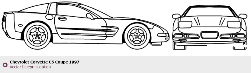 Raster blueprint of the 1997 Chevrolet Corvette C5 Coupe Coupe. This free downloadable image can be used for graphic projects, digital design, and 3D modeling. The file provides accurate exterior proportions of the vehicle. Model year: 1997. Body type: Coupe.