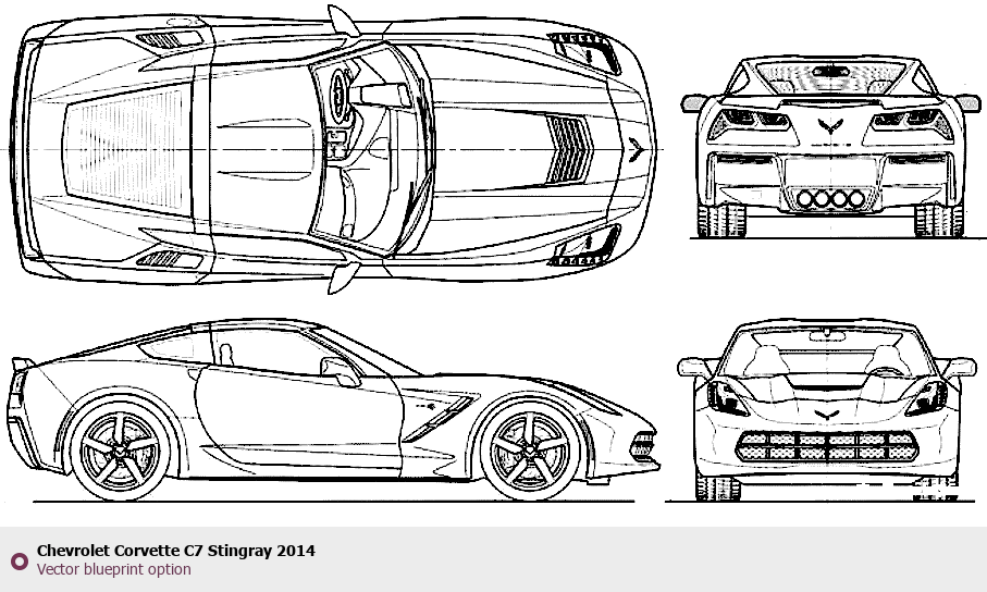 Raster blueprint of the 2014 Chevrolet Corvette C7 Stingray Tag. This free downloadable image can be used for graphic projects, digital design, and 3D modeling. The file provides accurate exterior proportions of the vehicle. Model year: 2014. Body type: Tag.