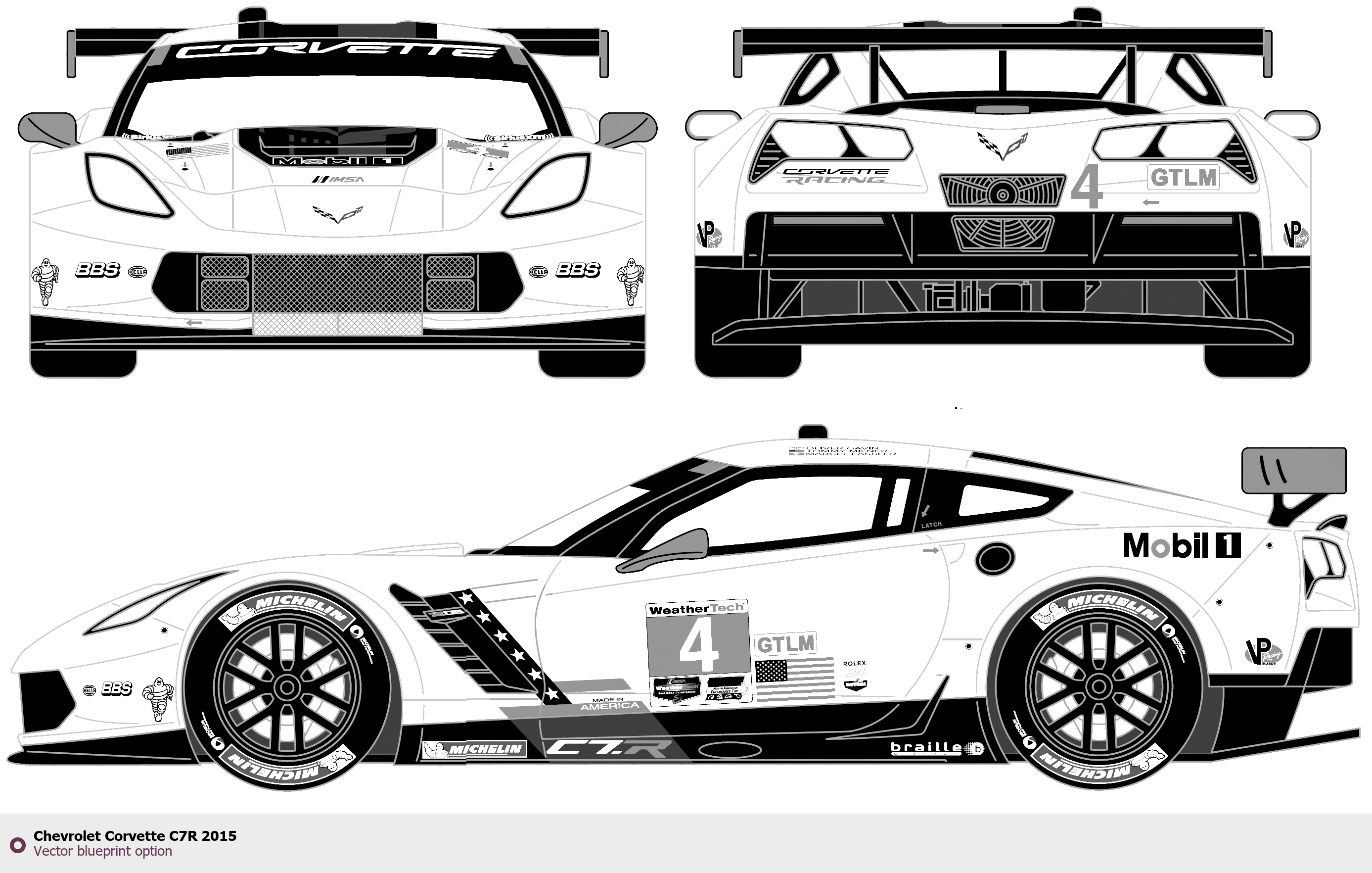 Raster blueprint of the 2015 Chevrolet Corvette C7R Tag. This free downloadable image can be used for graphic projects, digital design, and 3D modeling. The file provides accurate exterior proportions of the vehicle. Model year: 2015. Body type: Tag.