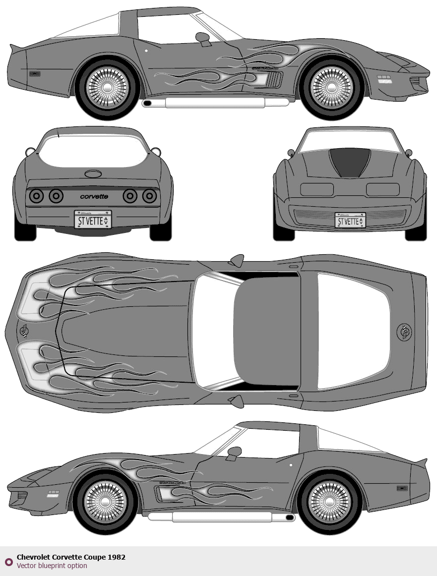 Raster blueprint of the 1982 Chevrolet Corvette Coupe Coupe. This free downloadable image can be used for graphic projects, digital design, and 3D modeling. The file provides accurate exterior proportions of the vehicle. Model year: 1982. Body type: Coupe.