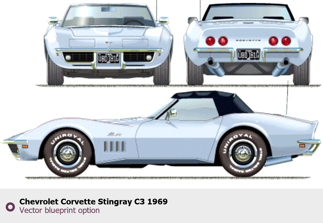 Raster blueprint of the 1969 Chevrolet Corvette Stingray C3 Tag. This free downloadable image can be used for graphic projects, digital design, and 3D modeling. The file provides accurate exterior proportions of the vehicle. Model year: 1969. Body type: Tag.