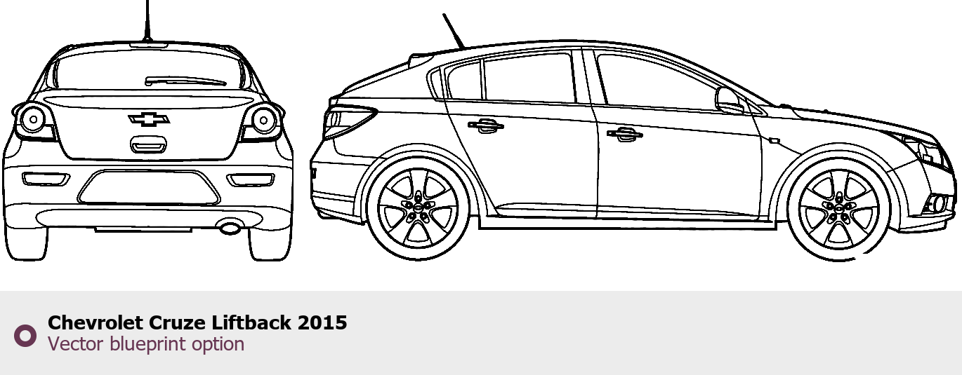 Raster blueprint of the 2015 Chevrolet Cruze Liftback Hatchback. This free downloadable image can be used for graphic projects, digital design, and 3D modeling. The file provides accurate exterior proportions of the vehicle. Model year: 2015. Body type: Hatchback.
