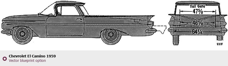 Raster blueprint of the 1959 Chevrolet El Camino Tag. This free downloadable image can be used for graphic projects, digital design, and 3D modeling. The file provides accurate exterior proportions of the vehicle. Model year: 1959. Body type: Tag.