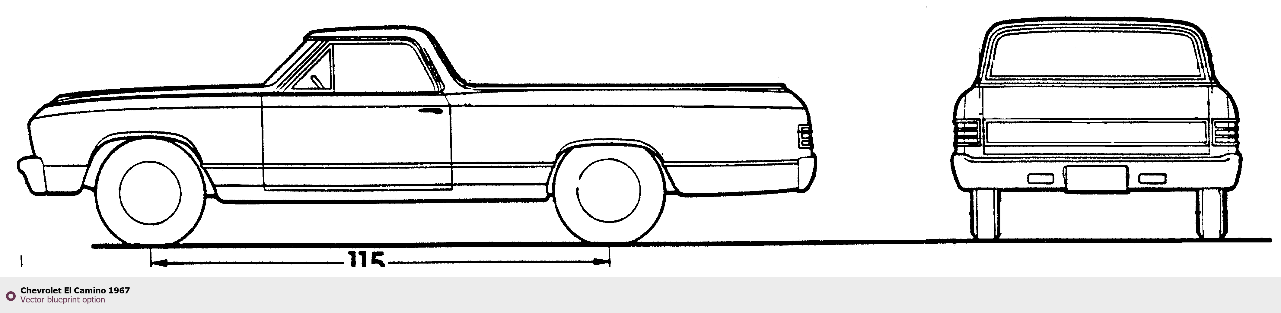 Raster blueprint of the 1967 Chevrolet El Camino Tag. This free downloadable image can be used for graphic projects, digital design, and 3D modeling. The file provides accurate exterior proportions of the vehicle. Model year: 1967. Body type: Tag.