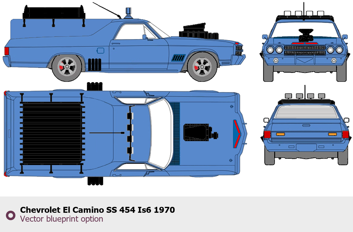 Raster blueprint of the 1970 Chevrolet El Camino SS 454 Is6 Sedan. This free downloadable image can be used for graphic projects, digital design, and 3D modeling. The file provides accurate exterior proportions of the vehicle. Model year: 1970. Body type: Sedan.