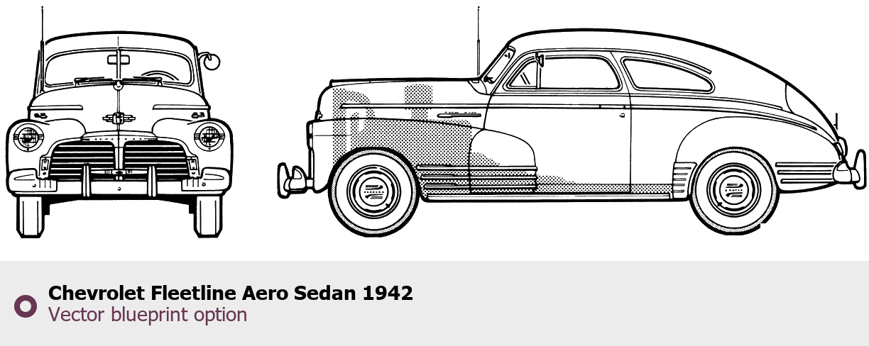 Raster blueprint of the 1942 Chevrolet Fleetline Aero Sedan Sedan. This free downloadable image can be used for graphic projects, digital design, and 3D modeling. The file provides accurate exterior proportions of the vehicle. Model year: 1942. Body type: Sedan.