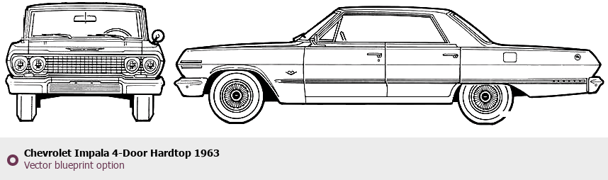 Raster blueprint of the 1963 Chevrolet Impala 4-Door Hardtop Tag. This free downloadable image can be used for graphic projects, digital design, and 3D modeling. The file provides accurate exterior proportions of the vehicle. Model year: 1963. Body type: Tag.