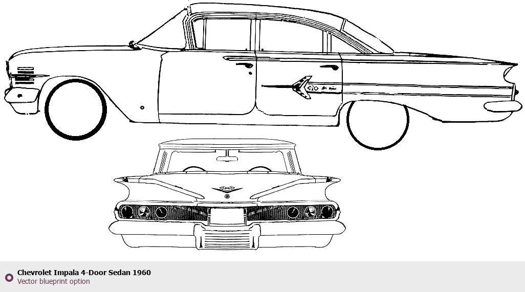 Raster blueprint of the 1960 Chevrolet Impala 4-Door Sedan Sedan. This free downloadable image can be used for graphic projects, digital design, and 3D modeling. The file provides accurate exterior proportions of the vehicle. Model year: 1960. Body type: Sedan.