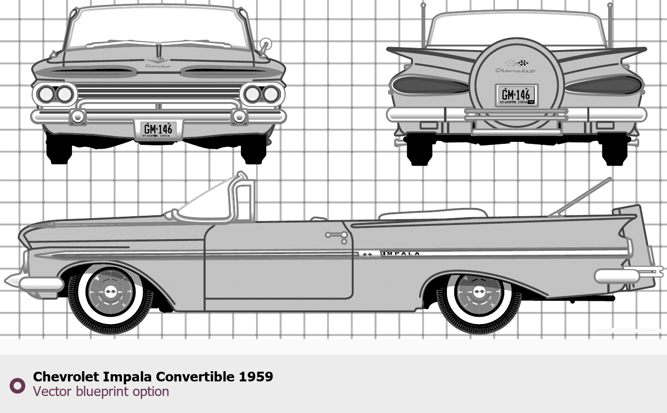 Raster blueprint of the 1959 Chevrolet Impala Convertible Cabriolet. This free downloadable image can be used for graphic projects, digital design, and 3D modeling. The file provides accurate exterior proportions of the vehicle. Model year: 1959. Body type: Cabriolet.