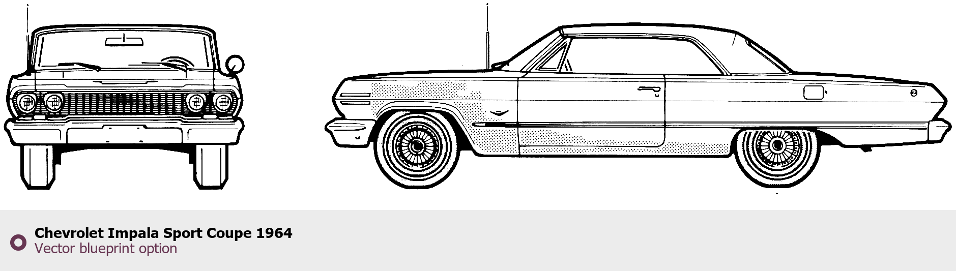 Raster blueprint of the 1964 Chevrolet Impala Sport Coupe Coupe. This free downloadable image can be used for graphic projects, digital design, and 3D modeling. The file provides accurate exterior proportions of the vehicle. Model year: 1964. Body type: Coupe.