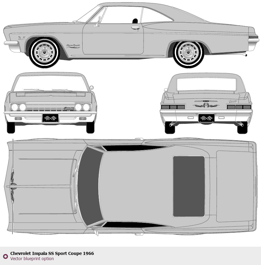 Raster blueprint of the 1966 Chevrolet Impala SS Sport Coupe Coupe. This free downloadable image can be used for graphic projects, digital design, and 3D modeling. The file provides accurate exterior proportions of the vehicle. Model year: 1966. Body type: Coupe.