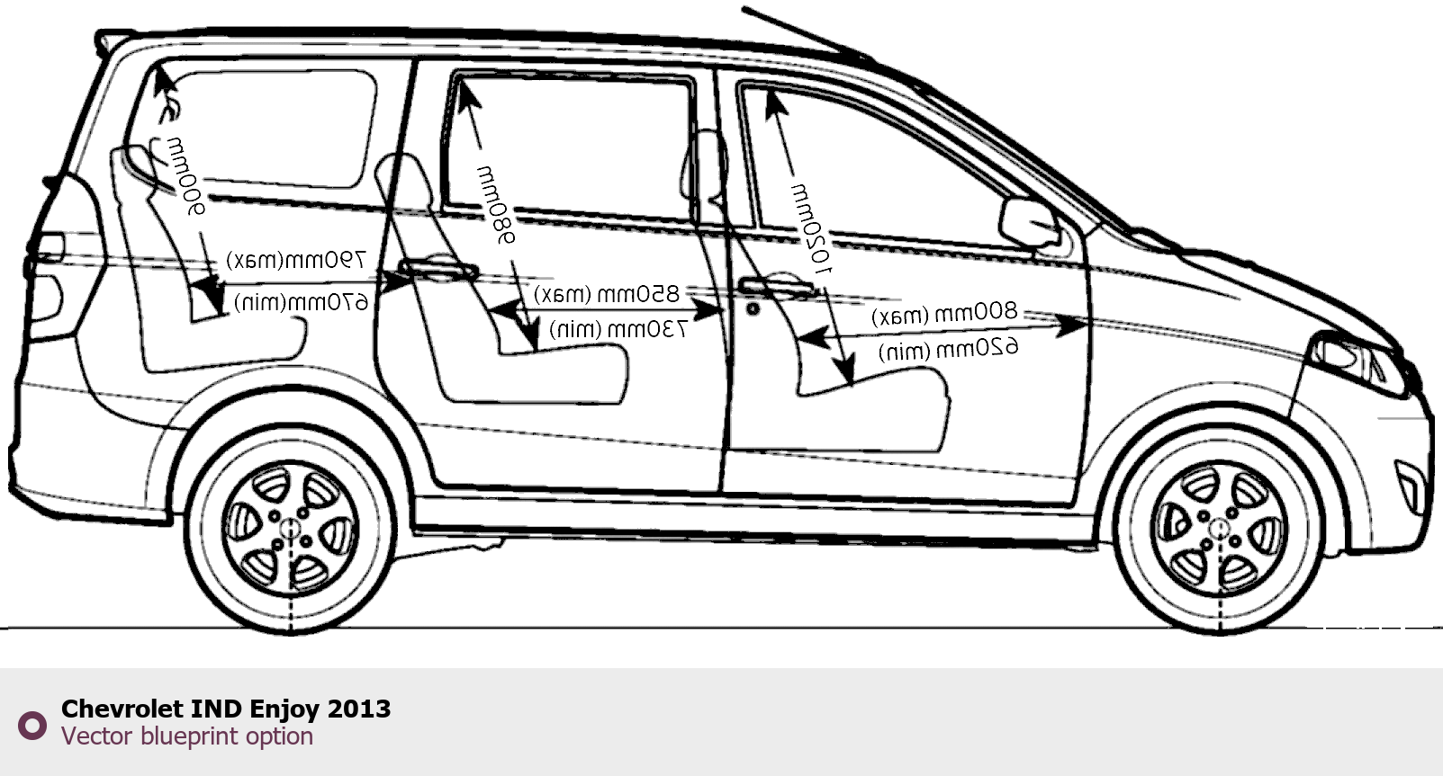 Raster blueprint of the 2013 Chevrolet IND Enjoy Tag. This free downloadable image can be used for graphic projects, digital design, and 3D modeling. The file provides accurate exterior proportions of the vehicle. Model year: 2013. Body type: Tag.