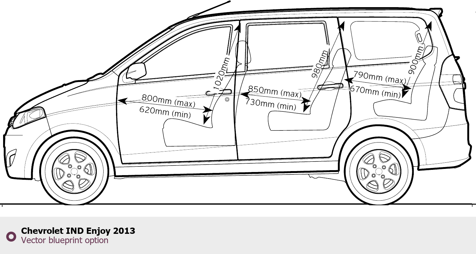 Raster blueprint of the 2013 Chevrolet IND Enjoy Tag. This free downloadable image can be used for graphic projects, digital design, and 3D modeling. The file provides accurate exterior proportions of the vehicle. Model year: 2013. Body type: Tag.