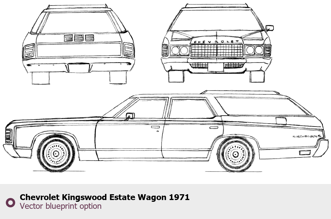 Raster blueprint of the 1971 Chevrolet Kingswood Estate Wagon Wagon. This free downloadable image can be used for graphic projects, digital design, and 3D modeling. The file provides accurate exterior proportions of the vehicle. Model year: 1971. Body type: Wagon.