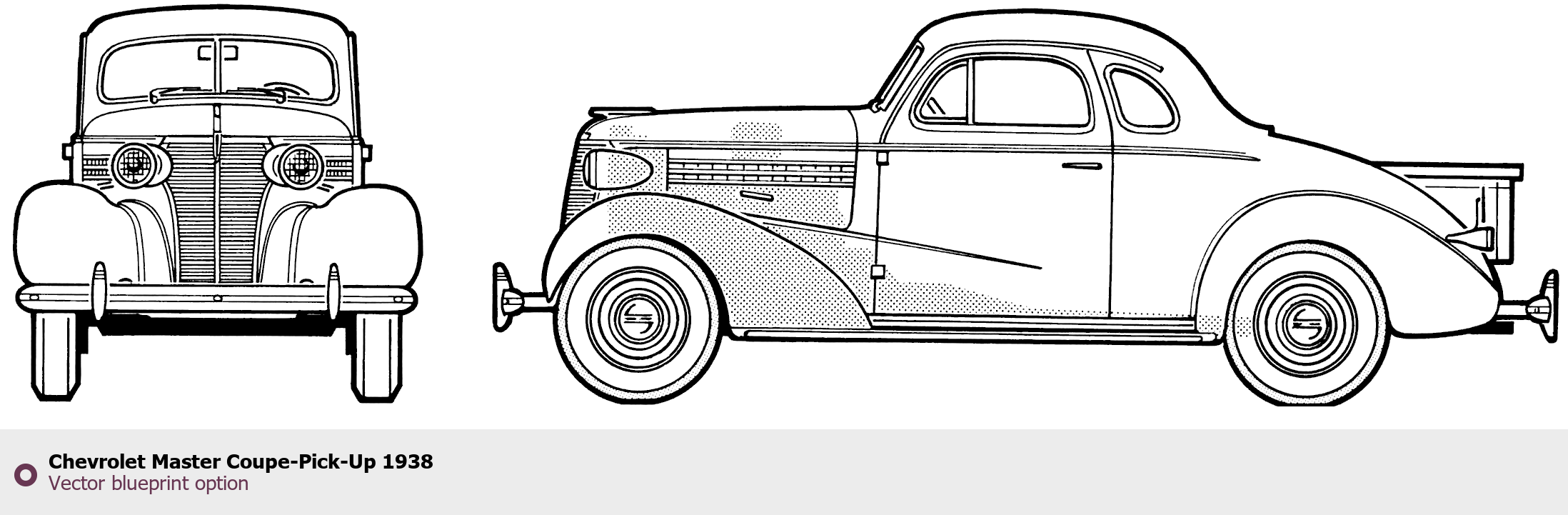 Raster blueprint of the 1938 Chevrolet Master Coupe-Pick-Up Sedan. This free downloadable image can be used for graphic projects, digital design, and 3D modeling. The file provides accurate exterior proportions of the vehicle. Model year: 1938. Body type: Sedan.