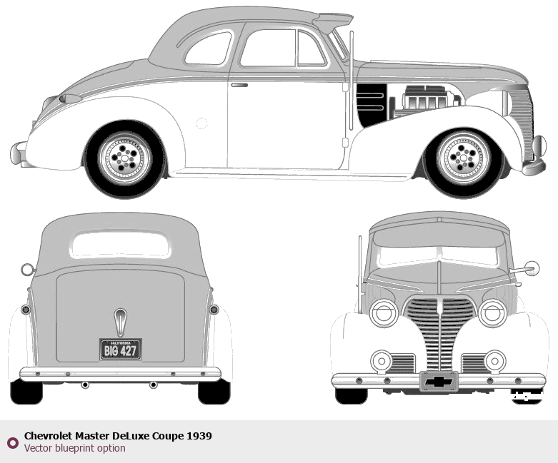Raster blueprint of the 1939 Chevrolet Master DeLuxe Coupe Sedan. This free downloadable image can be used for graphic projects, digital design, and 3D modeling. The file provides accurate exterior proportions of the vehicle. Model year: 1939. Body type: Sedan.