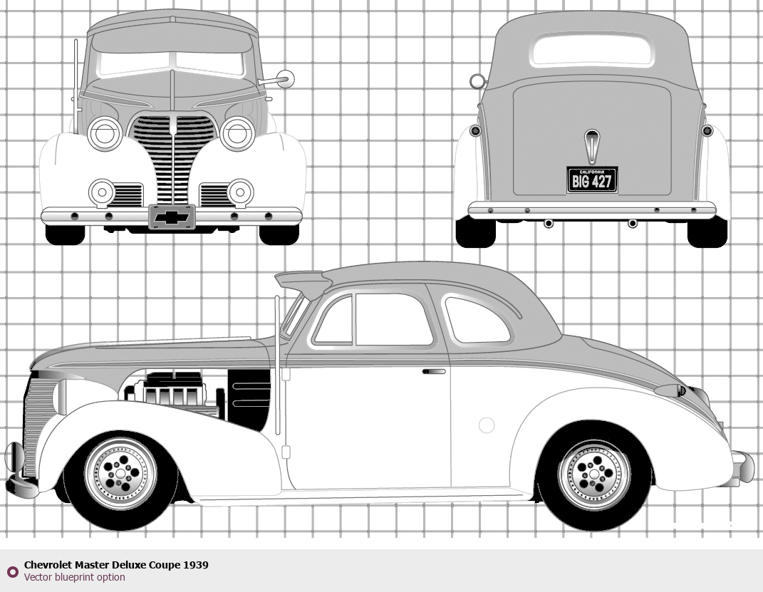Raster blueprint of the 1939 Chevrolet Master Deluxe Coupe Sedan. This free downloadable image can be used for graphic projects, digital design, and 3D modeling. The file provides accurate exterior proportions of the vehicle. Model year: 1939. Body type: Sedan.
