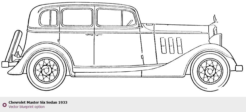 Raster blueprint of the 1933 Chevrolet Master Six Sedan Sedan. This free downloadable image can be used for graphic projects, digital design, and 3D modeling. The file provides accurate exterior proportions of the vehicle. Model year: 1933. Body type: Sedan.